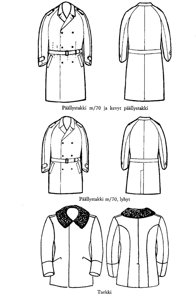 Napit: hopeanväriset. Vaihtoehtoisesti saadaan valmistaa edellä mainitun mukainen, hiukan polven yläpuolelle ulottuva päällystakki. 14 §. Päällystakki m/70. Väri ja kangas: tummansinistä sarkatyyppistä villakangasta.