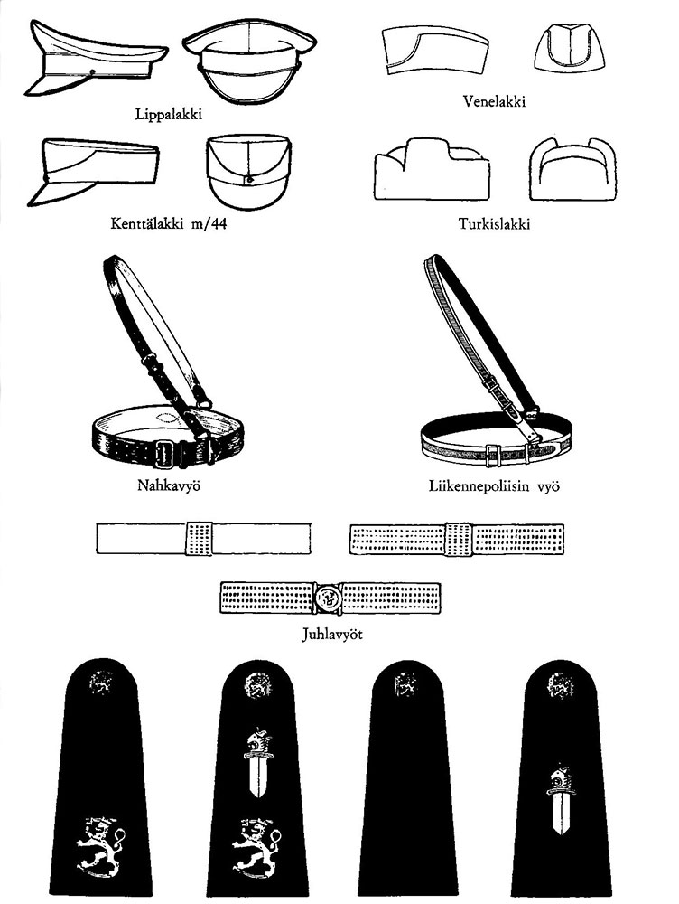 Olkaimet: Olkaimiin kiinnitetään päällystölle 3.5 cm korkuinen hopeanvärinen vaakunaleijona. Kaulus: Avohalkion yläpuolelle kiinnitetään mustalla laatalla 3 cm korkuinen poliisin tunnus, jonka alaosaa ympäröi tammenlehväseppele. Tunnus ja tammenlehväseppele ommellaan päällystölle hopealangalla ja muille vaaleanharmaalla silkkilangalla. Päällystöllä on pohjalaatta viisikulmainen, 4.5 cm korkea ja sitä ympäröi noin 1 mm levyinen punos, joka ylipoliisipäälliköllä, poliisiylitarkastajalla, poliisitarkastajalla, liikkuvan poliisin päälliköllä ja poliisipiirin päälliköllä on hopeanvärinen ja muilla musta.