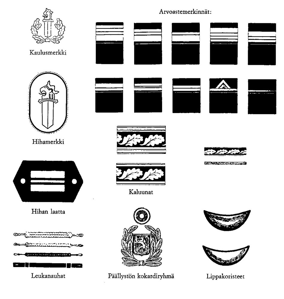 - poliisiylitarkastajalla ja Helsingin poliisimestarilla alinna yksi 40 mm levyinen tammenlehväkaluuna ja sen yläpuolella kaksi 10 mm levyistä tammenlehväkaluunaa;