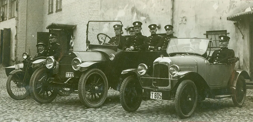 Ensimmäiset autot tulivat poliisin käyttöön 1900-luvun alussa ja moottoripyörät 1920-luvulla. Uudentyyppinen työväline toi uusia vaatimuksia myös virkapuvuille. Moottoriajoneuvoja kuljettavat konstaapelit mainitaan virkapukuasetuksessa ensimmäisen kerran vuonna 1929. Turun poliisilaitoksen auto-osasto 1920-luvulla.